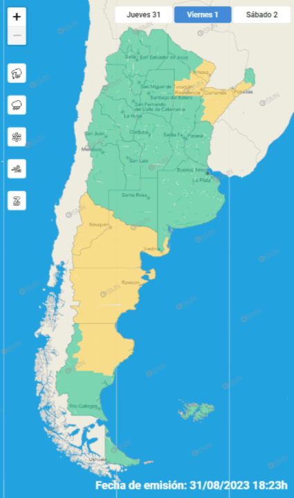 Según detalló el SMN, ambas provincias estarán afectadas por «vientos del sector oeste con velocidades entre 45 y 65 km/h y ráfagas que pueden alcanzar los 100 km/h».