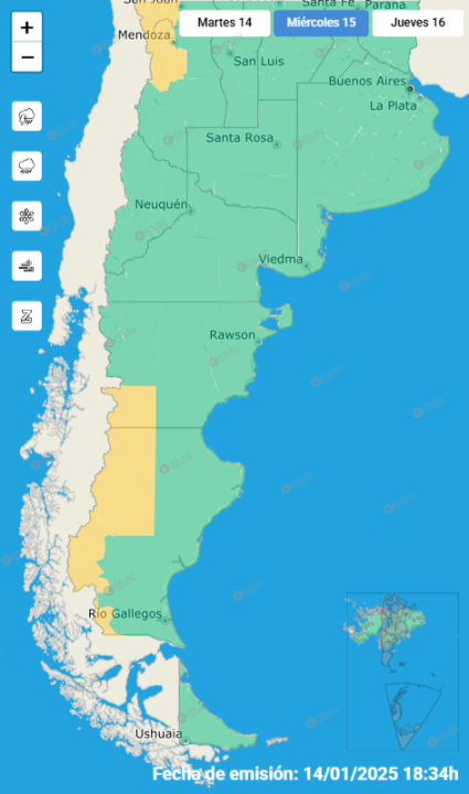 El SMN anunció alerta por «vientos del sector oeste con velocidades entre 45 y 65 km/h, con ráfagas que pueden superar los 90 km/h«, para el suroeste de Chubut, y el oeste de Santa Cruz.