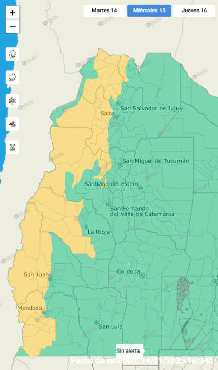 El SMN informó que, para las provincias de Jujuy, Salta, La Rioja, San Juan, Catamarca, Tucumán y Mendoza, se esperan «tormentas aisladas, algunas localmente fuertes».
