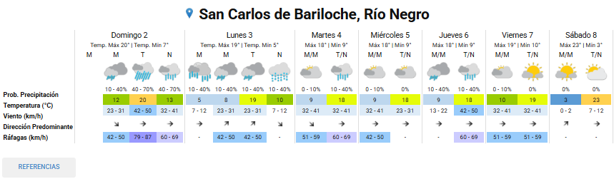 En San Martín de los Andes se aguarda un tiempo ventoso, con probabilidades de precipitación (entre un 10 y 40%) durante la tarde y noche.