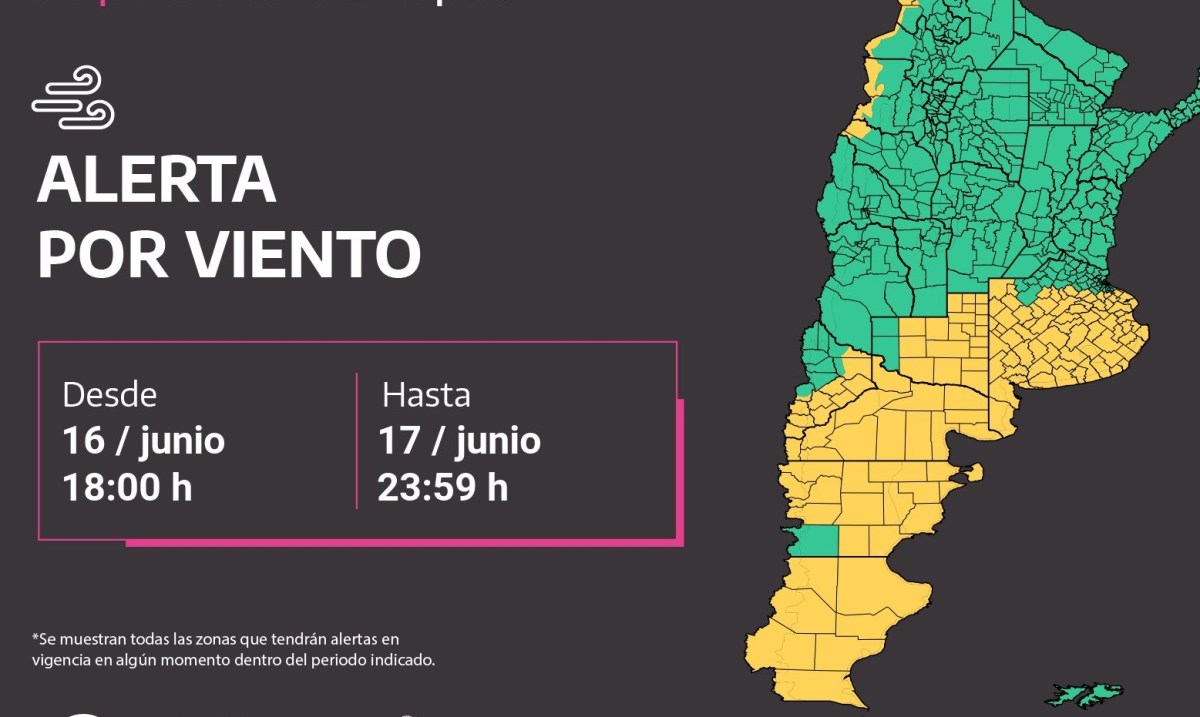 El alerta por viento también rige en gran parte de la Patagonia, salvo el suroeste de Chubut. También habrá vientos fuertes en gran parte de La Pampa y Buenos Aires.