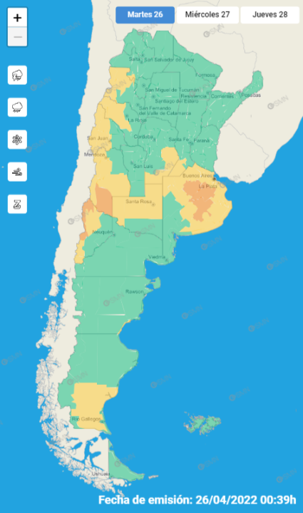 El organismo detalló que hay alerta amarilla durante la mañana y la tarde en: Este de Loncopué – Este de Picunches – Este de Ñorquín – Oeste de Añelo – Oeste de Pehuenches – Sur de Chos Malal – Sur de Minas.