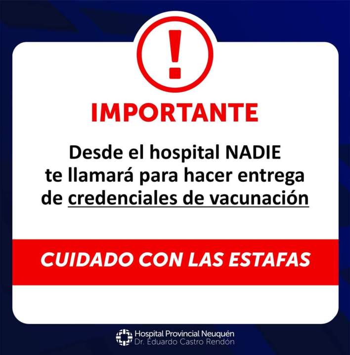 Desde el hospital Castro Rendón alertaron a la población de Neuquén por llamadas que usan el nombre de la institución con el fin de realizar estafas. Aclararon que no se contactan de manera telefónica para la entrega de credenciales sanitarias con el registro de los esquemas de vacunación de las personas.