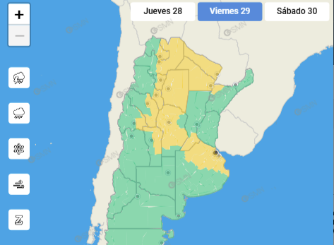 Las provincias en alerta son: Jujuy, Salta, Formosa, Chaco, Corrientes, Tucumán, Santiago del Estero, Catamarca, La Rioja, San Juan, San Luis, Córdoba, Santa Fe y Buenos Aires.