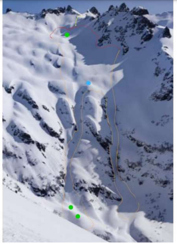 Según lo elaborado y publicado así es la vista frontal de la ladera. En amarillo se marca el punto de acceso de los esquiadores. En rojo la corona estimada. En naranja los laterales de la avalancha y sus límites inferiores. En verde la ubicación de los esquiadores arrastrados. En azul punto de extracción del helicóptero.