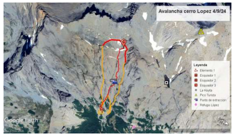 La pendiente, según especifica el informe, se encuentra en una zona alpina que desciende primero como una pala y luego se divide en 2 canaletas principales que finalizan a aproximadamente 1500 m de altitud, cercana al camino de acceso al refugio López.