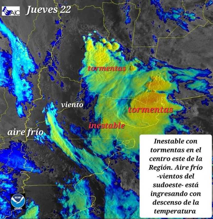 El área será afectada por tormentas, algunas localmente fuertes. Las mismas estarán acompañadas por abundante caída de agua en cortos períodos. También se pueden registrar fuertes ráfagas, importante actividad eléctrica y ocasional caída de granizo. Se esperan valores de precipitación acumulada entre 15 y 20 mm, pudiendo ser superados en forma puntual.