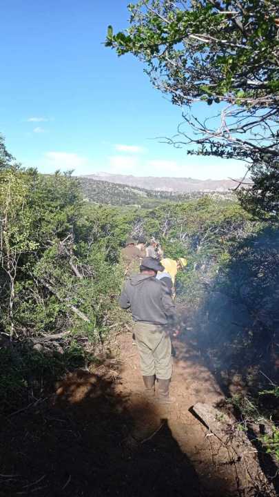 Hoy participación de 14 combatientes con dos vehículos de apoyo, recursos de la estación de combatientes de la estancia Rio Foyel, y colaboración del Servicio Nacional del Manejo del Fuego con un avión hidrante y un helicóptero.