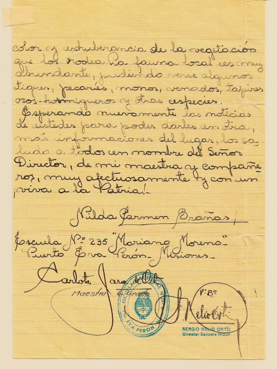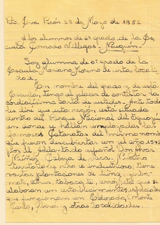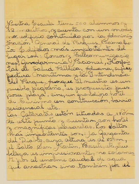 En 1952 Misiones aún era territorio nacional, no provincia, y los chicos de 4° y 6° grado estaban a cargo del Museo Escolar de la Escuela 301. Otros, que iban a clases en el Parque Nacional Iguazú, a 18 kilómetros de las Cataratas, les describieron la «belleza impresionante» de ese paisaje, en la pluma de Nilda, una alumna de 6° grado. También les habló de la producción de tuna, té, arroz, yerba y tabaco.