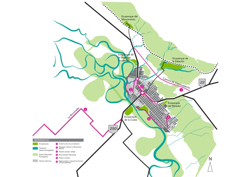 1.- El Nuevo Camino de Circunvalación partiendo del acceso al Parque Industrial, desembocando en la Avda. del Camino a la Estación, permitiendo acceder desde ahí nuevamente a la Ruta 22, generando una vía alternativa de acceso o circunvalación de la ciudad, pasando por el sector de barda norte, de gran riqueza paisajística.