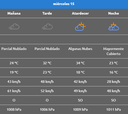 El viento será protagonista, con velocidades que irán de 44 a 46 km/h, mientras que las ráfagas más fuertes podrían alcanzar los 53 km/h. La dirección predominante será del oeste-suroeste.