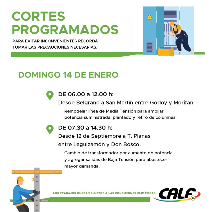 Detallaron que uno de los cortes es debido a la «remodelación de la línea de Media tensión para ampliar potencia suministrada, plantado y retiro de columnas». El otro es por el «cambio de transformador por aumento de potencia y agregar salidas de baja tensión para abastecer mayor demanda»