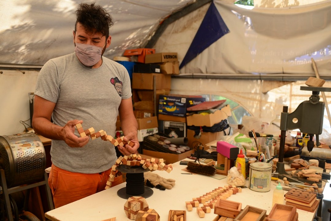 En la feria se puede encontrar a Nicolás en la parte exterior de la carpa porque es un puesto que siempre reúne mucha gente ya que “se pierde la percepción del tiempo y pueden pasar horas probando y mirando”, señaló el artesano al que se puede ver trabajando con sus piezas porque siempre se lleva tarea para acompañar las largas jornadas de 10 a 21 que tiene en el verano.