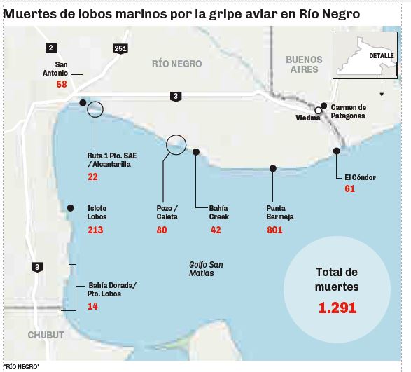 Según datos oficiales, hasta el 25 de octubre pasado, se registran casi 1.300 decesos de lobos en todo el territorio rionegrino, 800 de ellos en el sector del ANP donde se encuentra la colonia de estos animales más importante de la Patagonia.