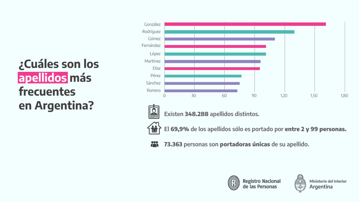Al mismo tiempo señaló que los más frecuentes de nuestro país son González, Rodríguez y Gómez,  le siguen Fernández y López, con más del 1% de la población cada uno a nivel nacional; y luego los apellidos Martínez, Díaz, Pérez, Sánchez y Romero, con cifras inferiores al 1%. Estos 10 apellidos, todos de ascendencia española, representan al 10.4% de la población nacional.