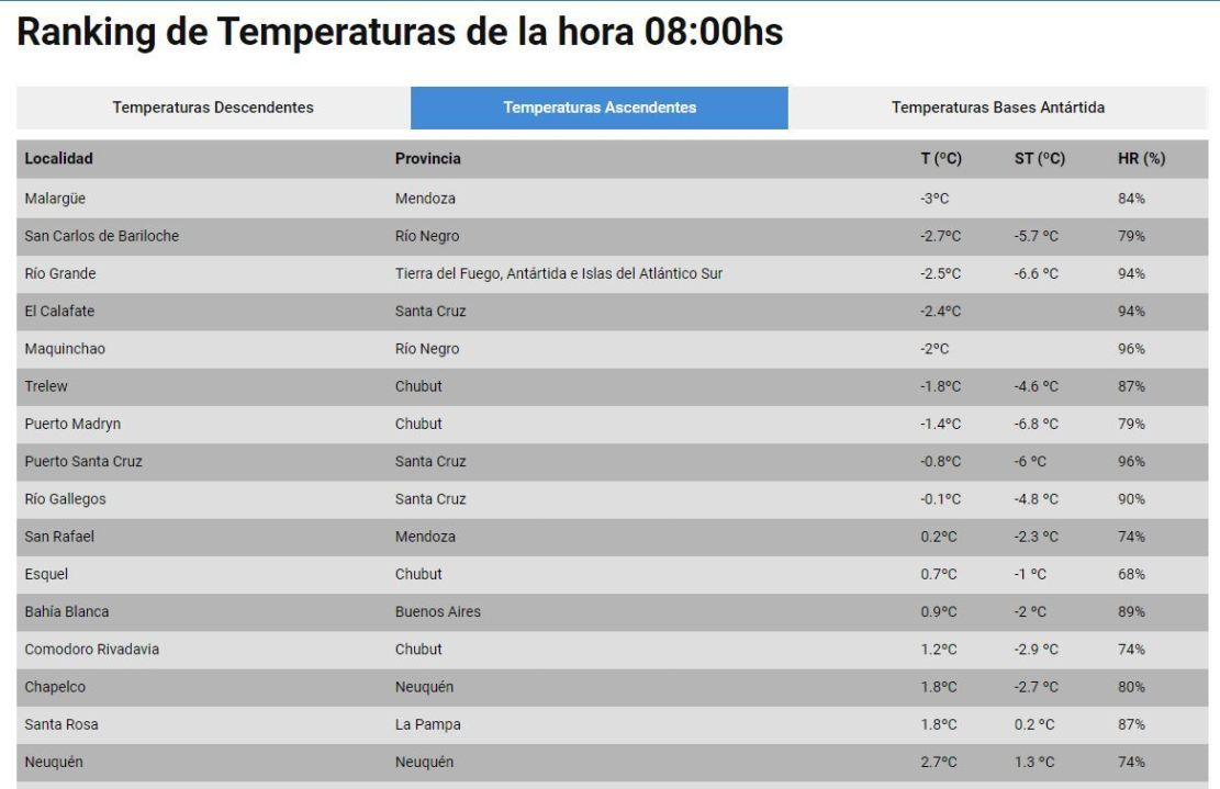 En el listado que publicó el organismo nacional, en el reporte de las 8, la mayor temperatura bajo cero la encabeza Malargüe, en Mendoza, con -3º C. Le sigue Bariloche, con menos -2,7ºC, una sensación térmica de -5,7º C, y una humedad relativa de 79%.