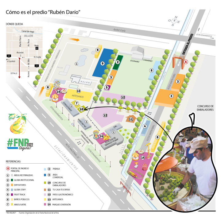 En esta nueva edición de la Fiesta, el estacionamiento pago comprende la vera de la Ruta 22 a la altura del km 1200, las calles Haydeé Coyla desde Martín Fierro hasta acceso Biló y Martín Fierro desde Haydée Coyla hasta ruta 65.