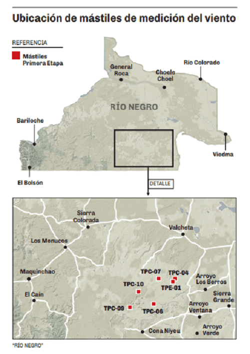 A esos seis seguirán otra docena mástiles de medición de viento, divididos en tres grupos y, todavía, sin definiciones. Serán 16 aunque eran 17. Sanguinetti aclaró que la empresa bajó una torre, a partir de su «cercanía de una zona roja» del plan de manejo ambiental de la zona de la Meseta Somuncura. «Prefirió evitar cualquier complicación», dijo.