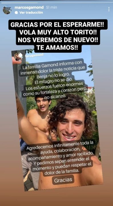 La noticia fue anunciada por la familia a través de un breve comunicado en las redes sociales. «La familia Gamond informa con inmenso dolor la triste noticia que Benja no lo logró«, comenzaron diciendo en el escrito.