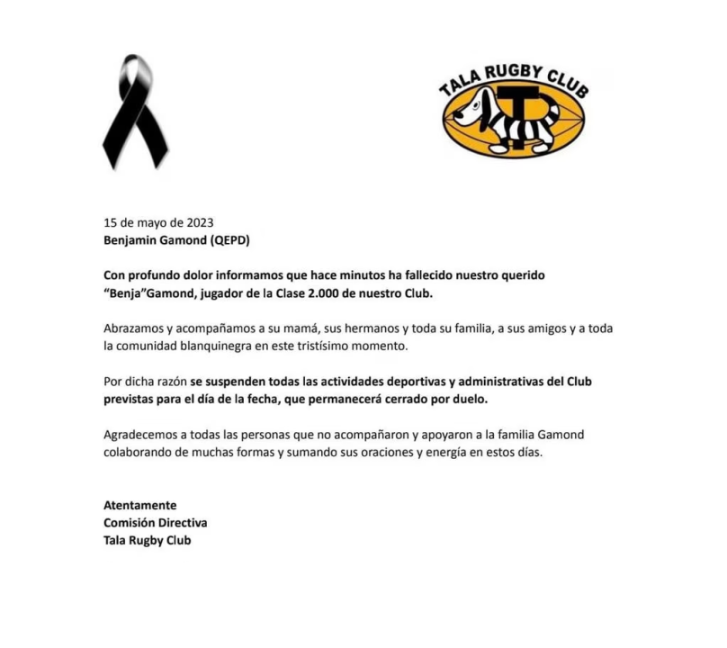 Por su parte el Club Tala, donde el joven jugaba al rugby, también emitió un comunicado. “Con profundo dolor informamos que hace minutos ha fallecido nuestro querido “Benja” Gamond, jugador de la clase 2.000 de nuestro Club”, publicaron.