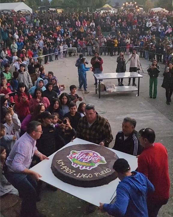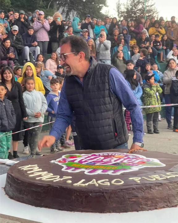 Turistas y pobladores de Lago Puelo degustaron un alfajor gigante de 76 kilos y un metro de circunferencia, elaborado con chocolate, dulce de frambuesa, dulce de leche y mousse de chocolate. Fue seleccionado como el mejor alfajor de la Patagonia.