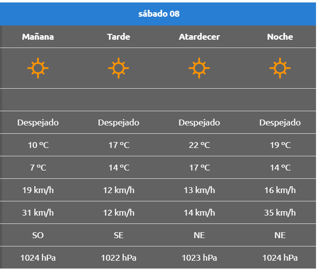 Por otro lado, en la tarde noche, a la hora de comer y disfrutar del paseo gastronómico, la temperatura subirá hasta una máxima de 22°C y la mínima se mantendrá en los 17°C. Respecto al viento, la ráfagas alcanzaran los 14 km/h.