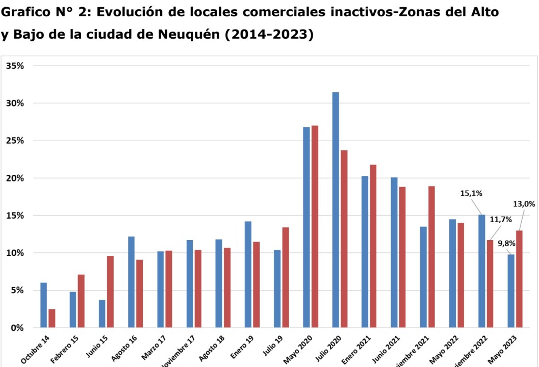 El gráfico muestra que entre noviembre de 2022 y mayo de este año, los niveles de inactividad en la zona comercial del alto decrecieron mientras que se han incrementado en la zona del bajo.
