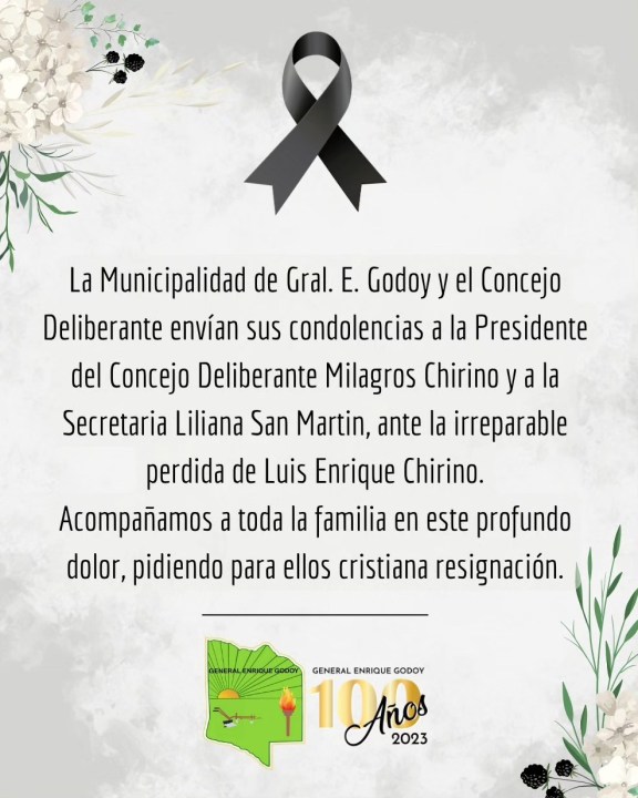 Desde el municipio de General Godoy expresaron sus condolencias a la familia de la víctima y en especial a «La Presidente del Concejo Deliberante Milagros Chirino (hermana) y a la Secretaria Liliana San Martín (mamá) ante la irreparable pérdida de Luis Enrique Chirino».
