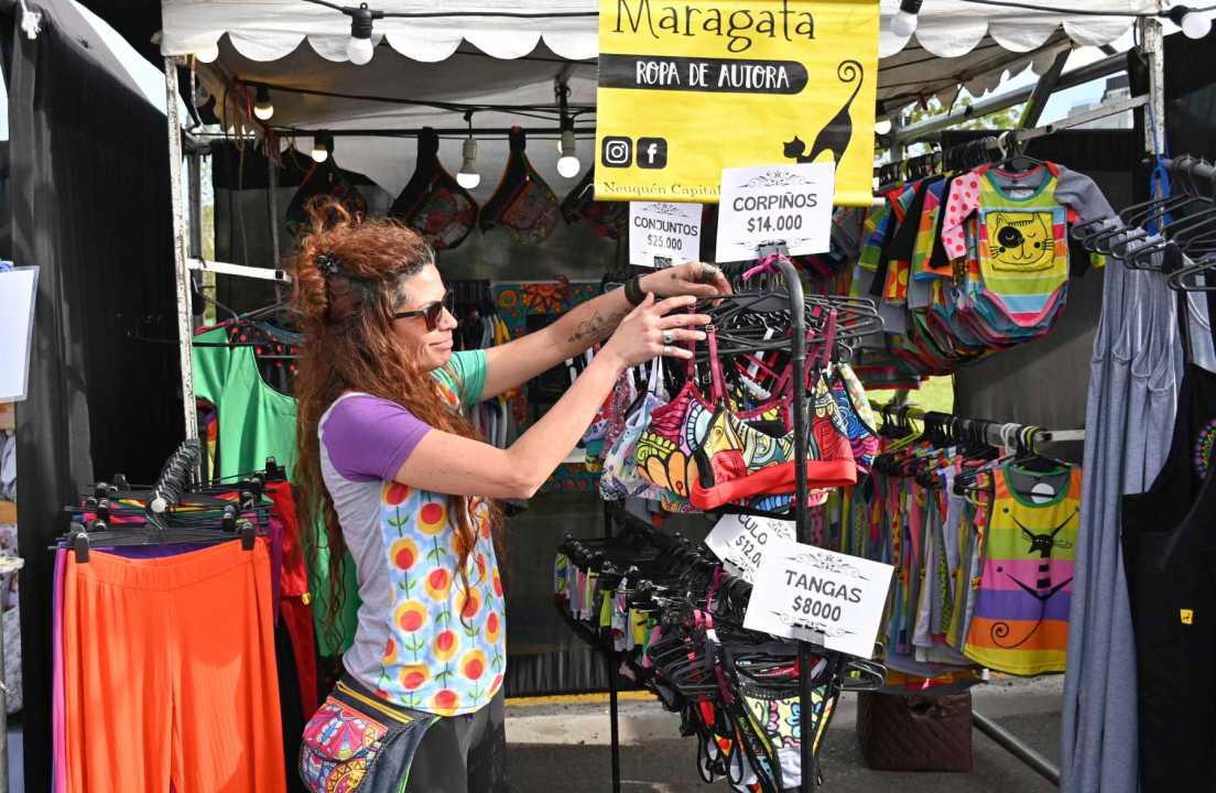 En este Neuquén Emprende hay en total 150 emprendedoras y emprendedores, 50 participan por primera vez. Una de ellas es Mara, que tiene su emprendimiento “Maragata, ropa de autora”. Hace dos años que esperaba tener la posibilidad de participar, y esta vez salió sorteada. En los percheros tiene lencería, vestidos y ropa para bebé. Cada una de esas prendas las hizo con sus propias manos. “Estuve toda la semana trabajando a full”, cuenta, “cosí unas 50 prendas, todas con diseños exclusivos para traer a la feria”. Mara, como otros emprendedores que están en la feria, vive 100% de su marca.