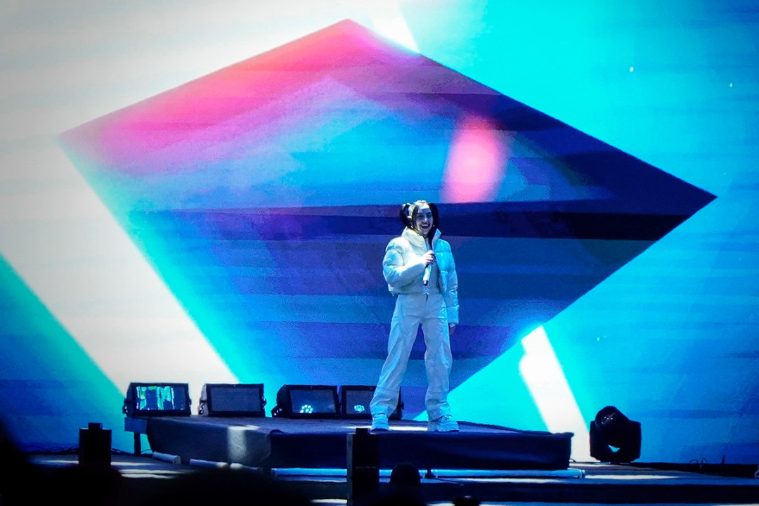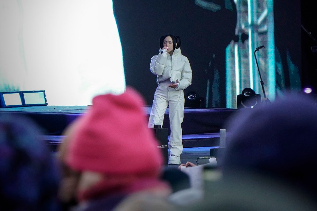 Nicki Nicole subió al escenario puntual, a las 18:30. Con una campera inflada color blanca y sus habituales colitas en el pelo, empezó su show ante una multitud que desbordó la plaza Catalina Reynal en el cerro Catedral, donde el atardecer se imponía, con el sol detrás de la silueta de la montaña nevada, lo que generaba un marco idílico para el recital al aire libre.