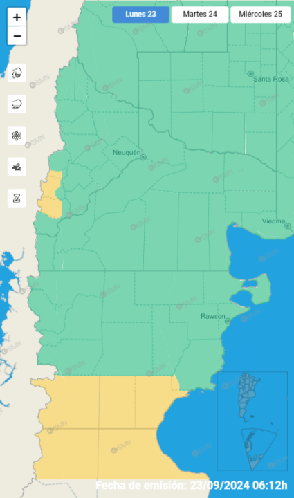 El reporte de este domingo, establecía que la cordillera de Aluminé, Chos Malal, Loncopué, Minas, Picunches, Ñorquín y la región de Los Lagos, también estaban incluidas. Sin embargo, según la última actualización del SMN, la situación cambió y se redujo la zona afectada por el alerta amarillo.