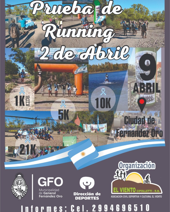 «Nuestra ciudad se está preparando para la novena prueba Running en conmemoración a los veteranos y caídos en la Guerra de Malvinas«, describieron desde la municipalidad. El evento es una iniciativa de Organización El Viento con el apoyo de la Dirección de deportes de la municipalidad de Gral. Fernández Oro.