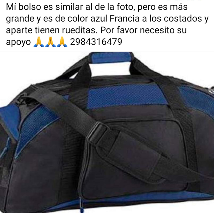 Explicó que su bolso es similar a uno de mano con la particularidad que tiene rueditas. Además indicó que es de tamaño mediano-grande y es negro con color azul en sus costados.