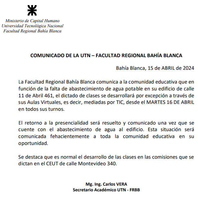 Por su parte, desde la Universidad Nacional Tecnológica se indicó que este martes y «en función de la falta de abastecimiento de agua potable en su edificio de calle 11 de Abril 461, el dictado de clases se desarrollará por excepción a través de sus aulas virtuales en todos sus turnos».
