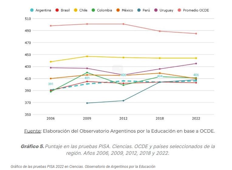 «El informe compara los resultados del año pasado con los desempeños en ediciones previas. Los datos de 2022 muestran que la Argentina queda rezagada con respecto a otros países latinoamericanos. En Matemática fue de 378 puntos y queda por debajo de Chile (412 puntos), Uruguay (409), Costa Rica (385), México (395), Perú (391), Colombia (383) y Brasil (379). Detrás quedaron Guatemala (344), El Salvador (343), Panamá (357), Paraguay (338) y República Dominicana (339)», destaca.