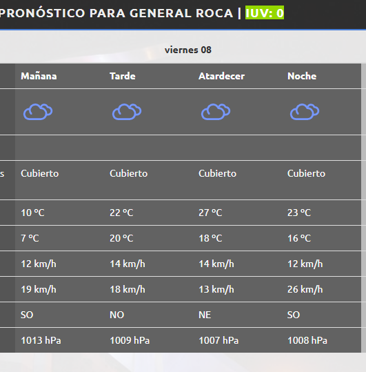 En Roca el panorama no será muy distinto. La mañana comenzará con un cielo cubierto que se mantendrá durante todo el día y con temperaturas de 10°C, esta máxima se elevará hasta los 27°C en el atardecer y hacia la noche se espera que descienda hasta llegar a los 23°C.