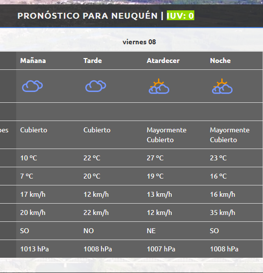 El viernes la jornada en Neuquén comenzará con un cielo totalmente cubierto con una temperatura de 10°C que en el transcurso del día comenzará a elevarse hasta los 27°C. Hacia el atardecer se notará un descenso pudiendo llegar hasta los 23°C en la noche.