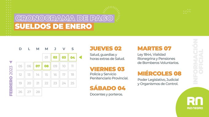 El próximo jueves 2 de febrero comenzará el pago de los salarios en la Administración Pública rionegrina, con la acreditación para el personal de Salud, incluidas las horas extras y las guardias.