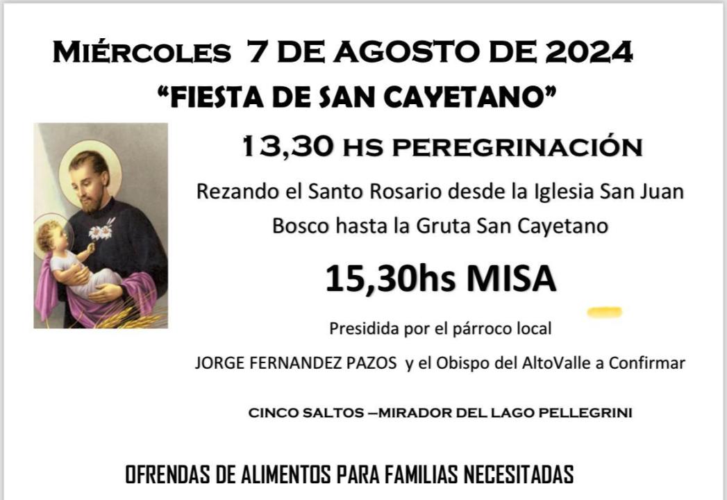 Como en cada año, uno de los puntos principales de las actividades estará en Cinco Saltos. Los fieles peregrinarán hasta la Gruta San Cayetano. Comenzará a las 13.30. Partirán rezando el Rosario desde la Iglesia San Juan Bosco. Luego, a las 15:30 se realizará la Misa en el Mirador del Lago Pellegrini.