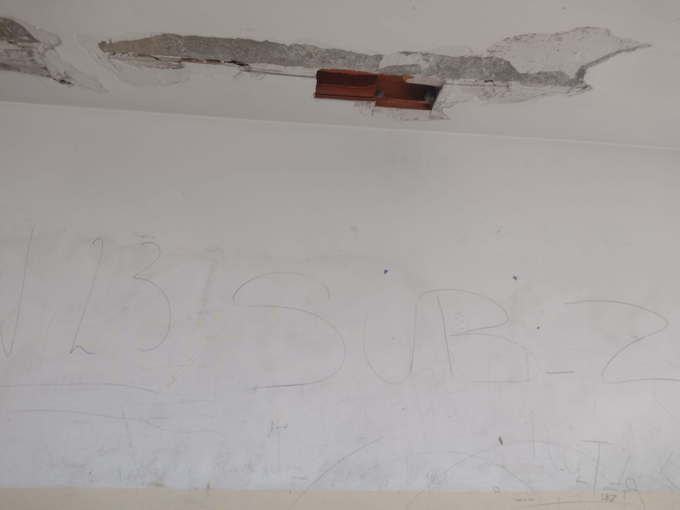 En el video se pueden ver los restos de material que se desprendieron del techo e impactaron contra los bancos escolares. Entre risas nerviosas, los estudiantes retrataron lo ocurrido.