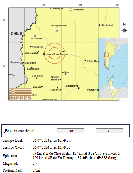 Un nuevo sismo se registró en la mañana de este viernes en Rincón de los Sauces, localidad identificada con Vaca Muerta. El Instituto Nacional de Prevención Sísmica (INPRES) informó que ocurrió a la 10:59, con una magnitud de 2.7 ml en la escala de Richter a 8 kilómetros de profundidad.