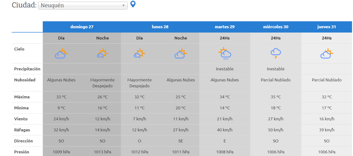 En Neuquén, la AIC informó que el domingo la temperatura máxima trepará a los 33°C y que el miércoles llegará a los 35°C. Además se esperan ráfagas de 50 km/h. El 29 y 30 de octubre, también se esperan lluvias.