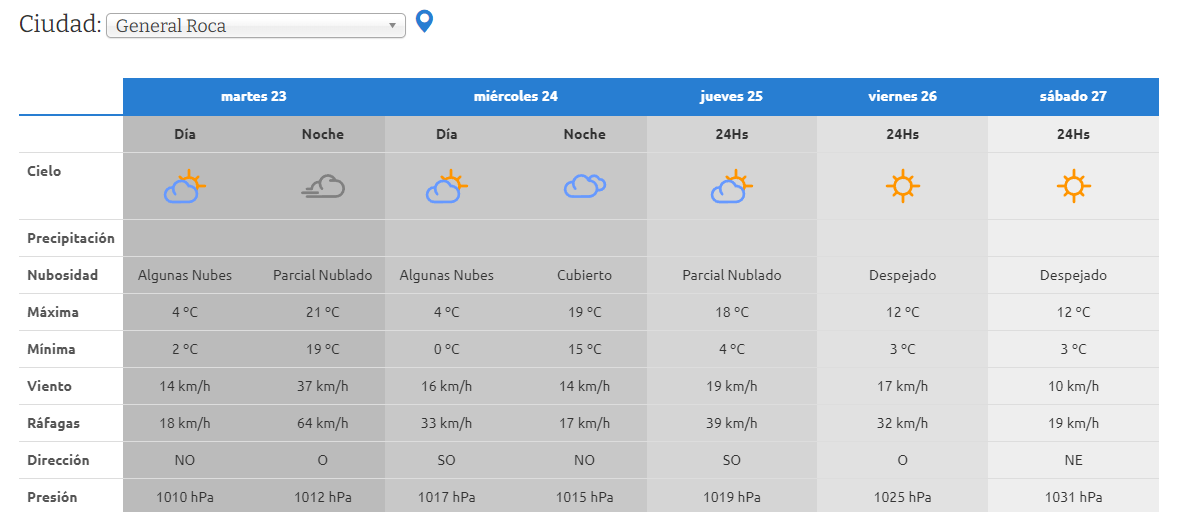 En Roca, este lunes se espera un día soleado con temperaturas entre 21°C y -2°C.