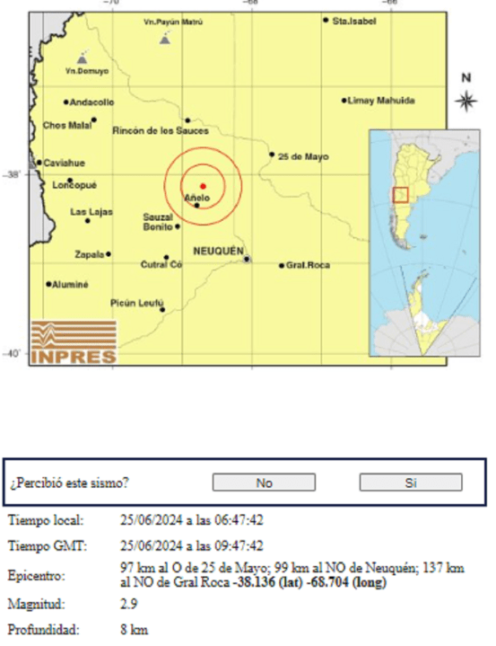 Según informó el Instituto Nacional de Prevención Sísmica (Inpres) fue de magnitud 2.9 y a 99 kilómetros al noroeste de Neuquén. Ocurrió a una profundidad de 8 kilómetros.