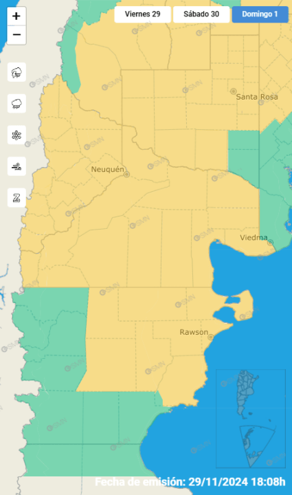 El SMN informó que este domingo, se esperan fuertes vientos del sudoeste, con velocidades entre 50 y 70 km/h, y ráfagas que pueden superar los 90 km/h, para la totalidad de las provincias de Neuquén y Río Negro.