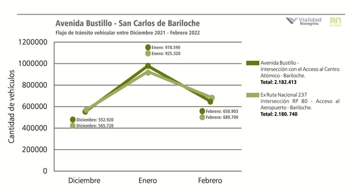 Con un sistema de contabilización vehicular ubicado en dos extremos del ejido urbano de Bariloche, se determinó que entre mediados de diciembre y mediados de febrero circularon un promedio de 2 millones de vehículos en Bariloche por cada extremo, con un impacto mayor en enero por la afluencia de turistas.