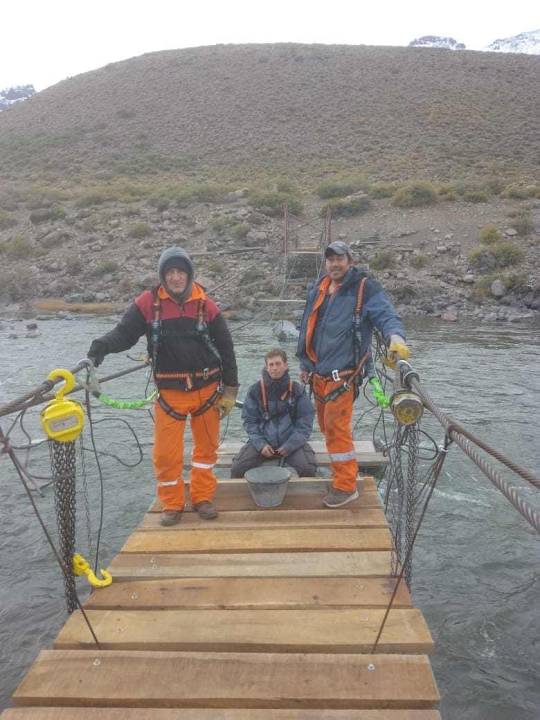 Los trabajadores de la dirección de Vialidad provincial continúan con la obra sobre un puente, mientras las lluvias y el viento del ciclón llegan al norte neuquino.