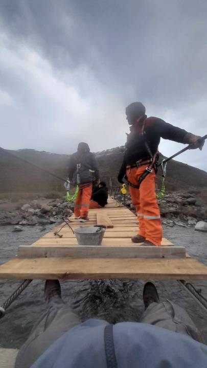 Las fuertes lluvias y el viento hicieron que el trabajo de los obreros por terminar una pasarela se convierta en una odisea.