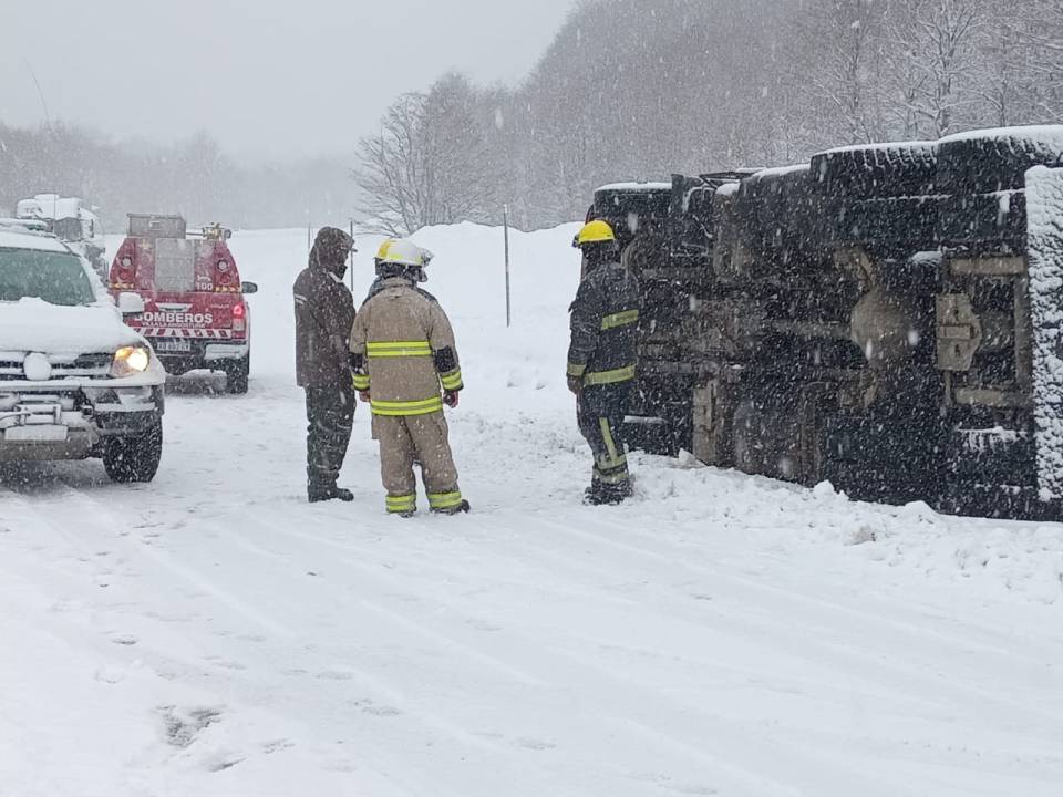 Las intensas nevadas registradas este jueves en los cruces fronterizos complicó la circulación de vehículos y transportistas. Durante la mañana un camión oriundo de Chile, sufrió un vuelco sobre la Ruta 231 a pocos kilómetros del paso Cardenal Samoré.