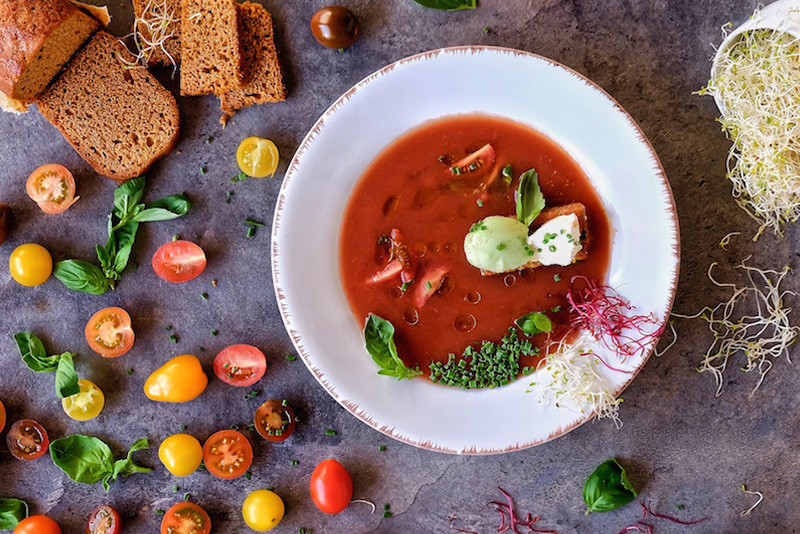 – Procesar o licuar los pepinos, los tomates, el ajo, la cebolla, el aceite de oliva, el vinagre de vino, el pan lactal y los morrones.